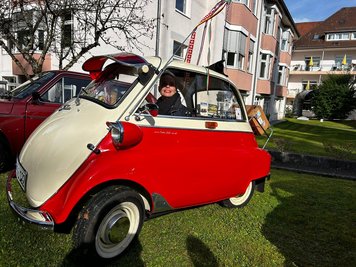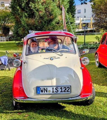Nicht zu toppen das Bild einer Isetta – dem kleinsten unserer Oldies – mit zwei Herren drin, die beide oben mit dem Kopf an der Decke anzustoßen schienen, mit einem breiten Lächeln im Gesicht. Nicht minder drollig die bezaubernde ältere Dame, die mit einem Plüsch-Alf auf dem Schoß fröhlich in einem Scirocco saß und herauswinkte. Während der Fahrt zeigten uns unsere Sitznachbarn, wo einst Gebäude standen, wo sie früher gearbeitet oder gewohnt haben und erzählten, welches Restaurant noch in Betrieb ist oder welcher Bäcker die besten Brezeln hat.